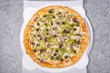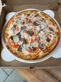 Pepperoni, sausage, ham, mushrooms, onions, green peppers .Red sauce base: freshly made dough, mouth-watering tomato sauce & cheese.