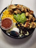 Meatless, rice, corn, beans, jalapenos, shredded cheese, shredded lettuce, side of sour cream & salsa.