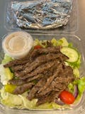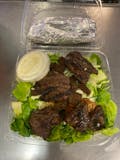 French fries, garden salad, house with salad, steak tips, grilled onions and grilled green peppers.