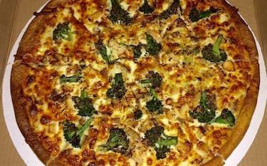 Cheese, white sauce, cut into 8, grilled chicken topping, roasted potatoes, broccoli and garlic.