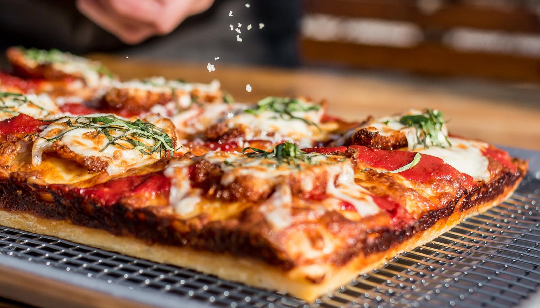 An in-house blend of regionally sourced jumbo lump crab meat & sweet blue crab claw meat, mixed with cream cheese, and blended into one of our amazing mozzarella & brick cheese topped Detroit style pizzas. Finished off with green onion and old bay for a true taste of Maryland.