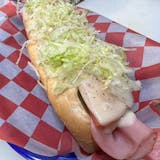 Chopped burger with mayo, pickles, onion, peppers, lettuce and tomato.