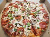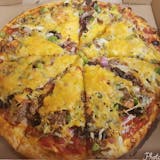 Generous portions of ground beef, bacon pieces, red onions, dill pickles topped with cheese blend. The sauce is a specialty sauces made just for this pizza
