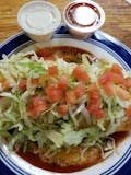With taco seasoned refried beans, mexican cheese, lettuce, tomatoes and served with a side of salsa and sour cream.