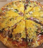 Based with salsa and topped with seasoned ground beef, red onion, black olives, tomatoes, green peppers and a blend of cheeses.