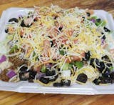 Diced chicken, bacon, red onion, green peppers, lettuce, tomatoes, ranch dressing and special blend of cheeses.