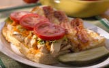 Marinated broiled chicken breast strips, bacon, ranch, cheese, lettuce, and tomatoes.
