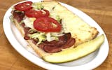 Thinly sliced ribeye steak covered with mushrooms, onions, green peppers, cheese, lettuce, tomatoes, and mayo.