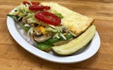 Green peppers, onions, mushrooms, cheddar, and white cheese, lettuce, tomatoes, and mayo.