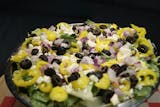 Lettuce, onion, black olives, feta cheese, beets, cucumber, pepperoncini