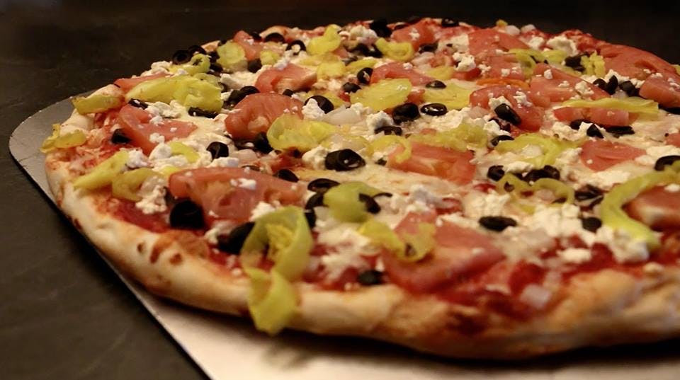 Mozzarella and feta cheeses, onions, tomatoes, black olives, and pepper rings.