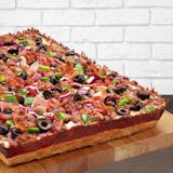 Pepperoni, ham, Italian sausage, ground beef, bacon, mushrooms, red onions, green peppers & black olives.