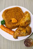 Caramelized onion sauce with tender chicken leg quarter or fish served with white or yellow rice.