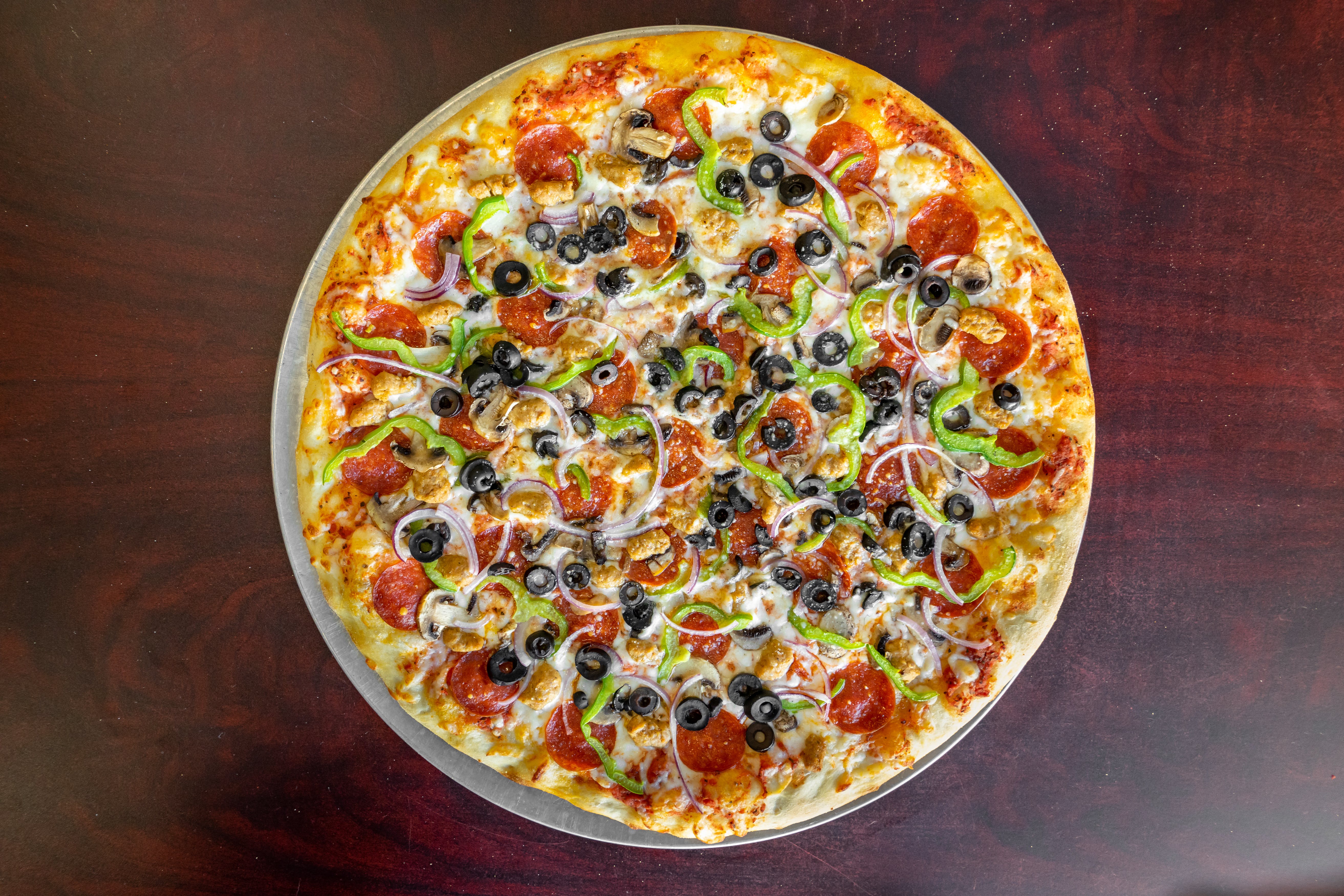 Pepperoni, sausage, green pepper, red onion, mushrooms, and black olives
