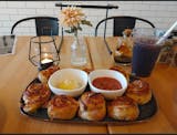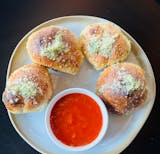 4 garlic knots prepared with our fermented dough and proofed between 48 to 72 hours accompanied by our San Marzano tomato sauce and garlic butter