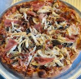 Mozzarella, San Marzano tomato sauce, pepperoni, ham, sausage, bacon, sautéed eggplant, oven roasted zucchini, roasted peppers, olives, peppers, red onion, Fungi Trifolati (porcini, Shiitake, mushrooms, Portobello).