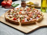Red sauce, mozzarella cheese, mushrooms, onions, crispy red onions, fresh green peppers, sliced black olives, juicy tomatoes & sliced artichoke hearts.