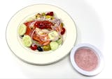 Comes over a bed of lettuce with fresh mozzarella, tomatoes, basil, black and green olives, roasted peppers, balsamic vinegar & oil.