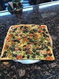 Square pan with marinara, mozzarella, fresh basil, and extra virgin olive oil.