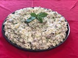 Sliced potatoes, crispy bacon, cheddar, mozzarella, and cream sauce.