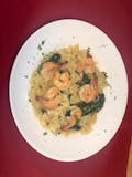 Sautéed with wine pesto sauce with roasted peppers & shrimp. Over linguini.
