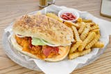 Fried chicken, bacon, lettuce, tomato, and ranch dressing.