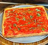 Our Famous Grandma's Original pizza: a square shaped, thin and crispy crust, creamy mozzarella cheese, homemade marinara sauce, and a sprinkle of blended herbs. Each bite is a journey to flavor paradise.