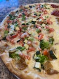 A flavorful pizza topped with sliced plum tomatoes fresh mozzarella, sweet basil,drizzle with extra virgin olive oil