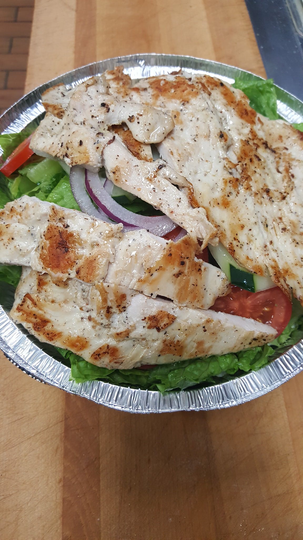 Grilled chicken, fresh mozzarella, roasted peppers & tomatoes over romaine lettuce.