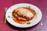 Shredded parmesan cheese, chicken breast, tomato sauce, and mozzarella cheese.