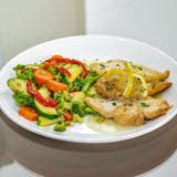 Lightly floured chicken with sausage, potatoes, and sweet peppers, in a brown sauce. Served with a side of vegetables.
