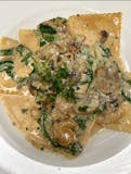 Vegan ravioli stuffed with spinach and cannellini beans. Served in a sherry vegan cream sauce with mushrooms, onions, and spinach