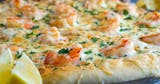 White pizza with shrimp, saute in garlic white lemon sauce.
