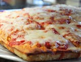 Thick crust square pizza with tomato sauce and mozzarella cheese.