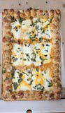 Grandma style pizza/ vodka sauce, fresh mozzarella on a garlic knot crust, extra garlic, parmigiano and basil.
