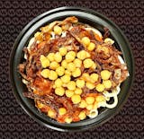A flavorful mix of pasta, rice, lentils, and chickpeas, topped with a rich homemade spiced tomato sauce and finished with sweet caramelized onions.
