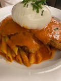 Homemade pasta with beef, fresh mozzarella, and ricotta cheese.