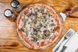 Vodka sauce with chicken, mozzarella, mushrooms, peas, and prosciutto.