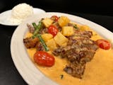 Grilled salmon topped with minced shrimp in garlic sauce. Serving with side jasmine rice.