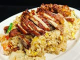 Deep-fried duck on top of Thai fried rice with pineapple, onion, egg, tomato and scallion.