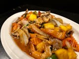Spicy. Chicken, beef, shrimp, fresh mango, carrots, tomato, onion, scallion, and bell pepper. Serving with side jasmine rice.