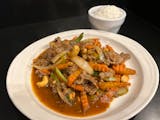 Stir-fried with ginger, bell pepper, onion, scallion, mushroom, celery, and carrot. Serving with side jasmine rice.