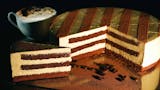 A chocolate sponge base topped with a dark chocolate mousse and dusted with cocoa powder.