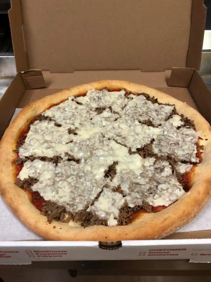 Pizza sauce, cheesesteak meat, fried onions, and American cheese.