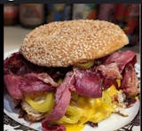 Indulge in a hearty breakfast with our Steak Egg n Cheese sandwich. Made with tender steak, fluffy eggs, and melted cheese, all nestled between brioche bun with a hint of butter. Seasoned with salt, pepper, and sautéed onions for a delicious twist. Perfect for a satisfying start to your day.
