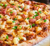 Juicy Pineapple chunks, sausage/savory ham or your choice of meat, with melted mozzarella cheese in a sweet and tangy tomato sauce. This pizza brings a touch of the tropics to your table.