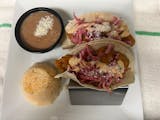 2 Baja Fish Tacos /Cabbage salad Chipotle Aioli with Rice & Beans
