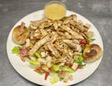 Romaine lettuce, sweet peppers, croutons, caesar dressing and grilled chicken strips.