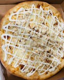 Topped with tomato sauce, fresh mozzarella, fresh garlic, mozzarella, basil, oregano, parmesan cheese & olive oil.