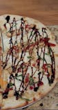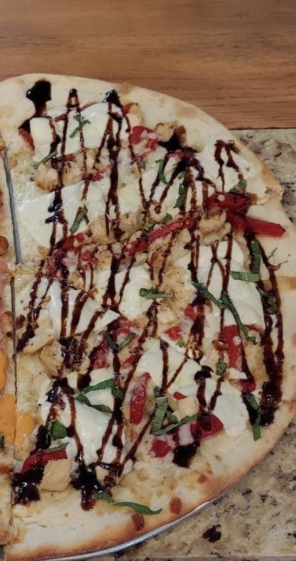 White pie with grilled chicken, roasted peppers & basil pesto.